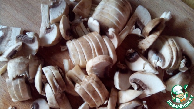 Грибы моем, режем пластинками и добавляем с луку и моркови.
