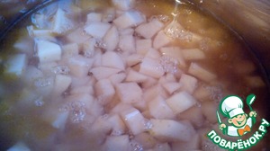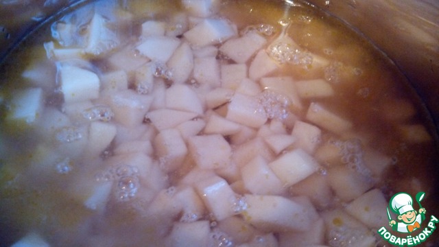 Добавляем картофель в казанок с поджаркой и заливаем водой так, чтобы она слегка закрывала овощи.