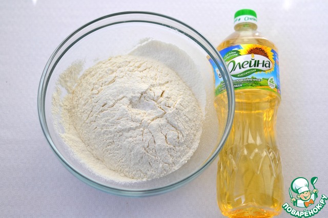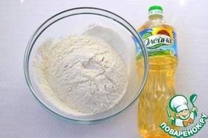 Муку просеять с солью и разрыхлителем, растительное масло "Олейна" рафинированное, лимонный сок, теплую воду (примерно 50 градусов). -