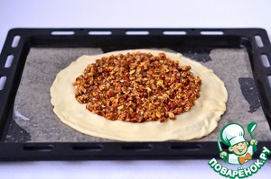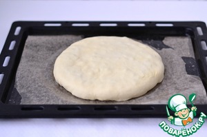 На застеленный пекарской бумагой противень (смазать растительным маслом "Олейна") выкладываем первый круг из теста.