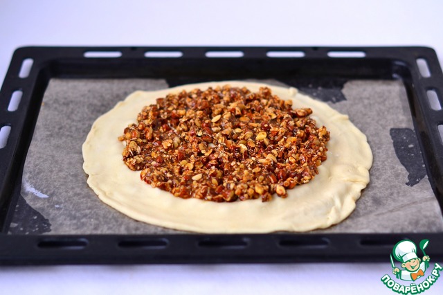 Накрываем вторым кругом из теста, выкладываем оставшуюся начинку, накрываем последним кругом теста. -