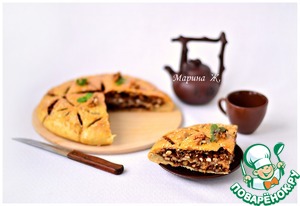 Смазать пирог чайной заваркой или водой, посыпать кунжутом.