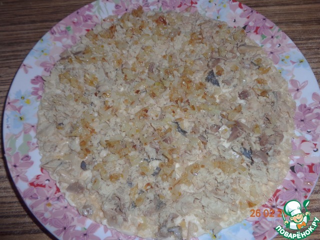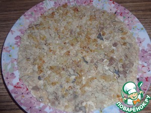 Лук мелко нарезать и обжарить на раст. масле. Распределить по поверхности рыбы и накрыть вторым коржом.
