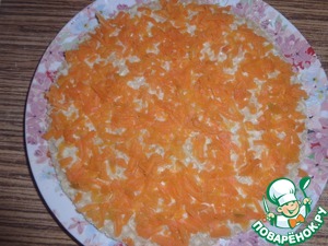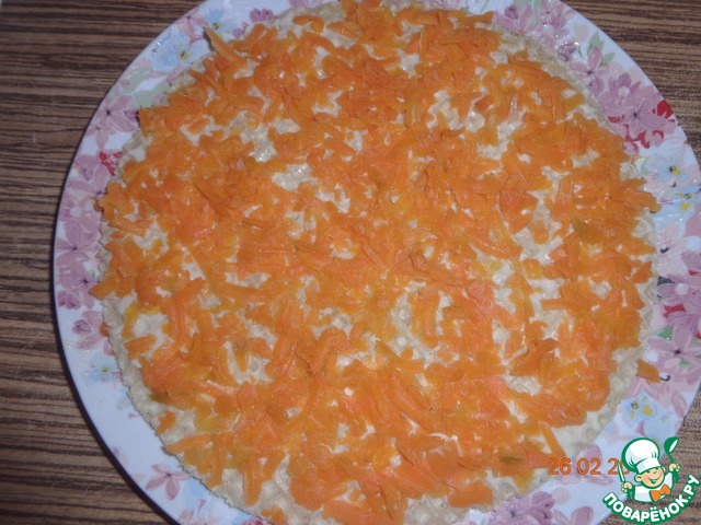 Корж смазать майонезом и по поверхности коржа распределить тертую вареную морковь и накрыть коржом.