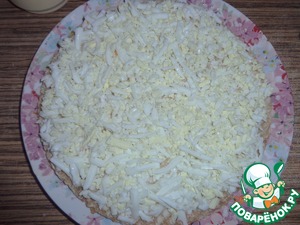 Опять смазываем майонезом и распределяем тертые куриные яйца. Накрываем коржом.