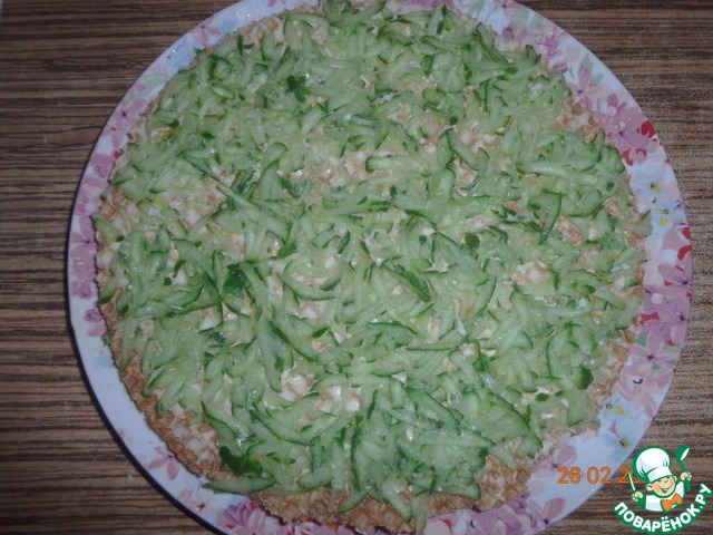 Смазать майонезом. Огурцы натереть на терке, отжать и распределить по поверхности коржа. Зелень мелко нарезать и посыпать на слой огурца. Накрыть след. коржом.