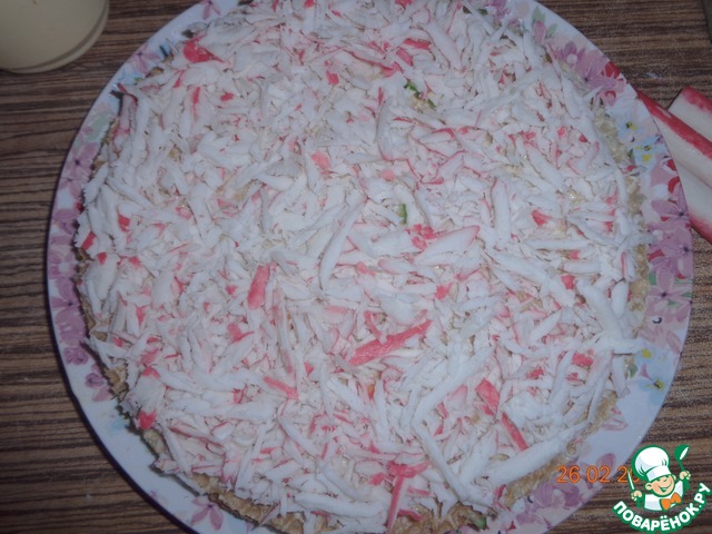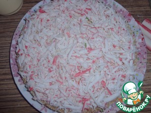 Смазать корж и распределить по нему тертые краб. палочки (немного оставить для украшения). Накрыть след. коржом.