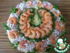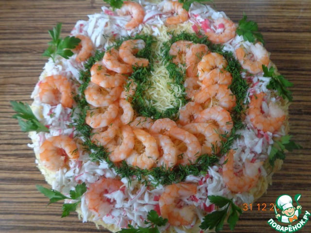 Последний корж и бока смазать майонезом. Посыпать тертым сыром. Украсить по-желанию. Дать пропитаться как минимум часа 3-4. Я украшала креветками, зеленью и тертыми краб. палочками. Приятного аппетита!!!