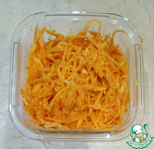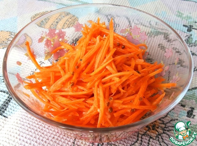 Перемешиваю все ингредиенты. Кориандр беру горошком и немного "раздавливаю". Не жду. Перемешала все в миске, затем перемешала с натертой морковью. И в холодильник на 4 часа.