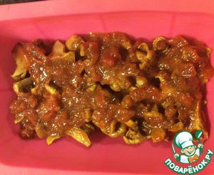 Накрываем листом, опять выкладываем обжаренные грибы и поливаем томатной заливкой. Сверху кладем последний лист лазаньи и заливаем соусом. Слегка придавливаем и запекаем в духовке при 200 С 35 минут.