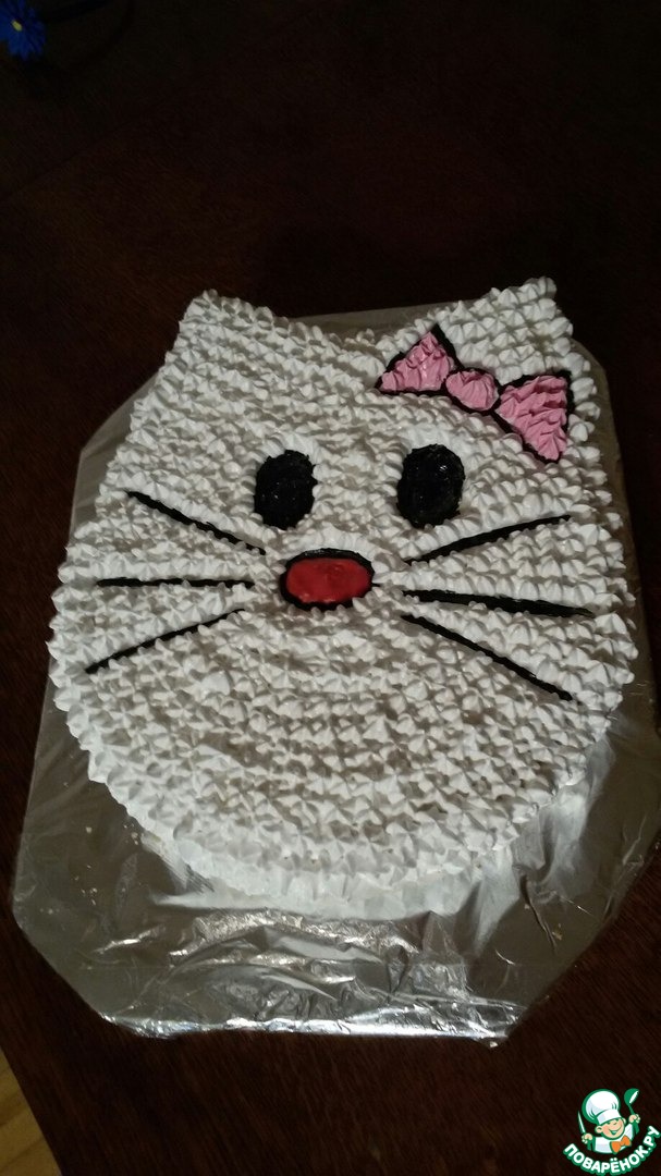 p.s. когда второй корж пропитан сиропом обмазываем торт и бока кремом 2, а затем в кондитерский мешок с насадкой звездочка выкладываем крем и наносим рисунок, усы глаза и контур банта сделаны пищевой краской, нос отделан кремом 1, а бант кремом 2.
