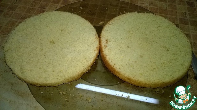 Больший бисквит разрезать поперек на 2 коржа, меньший поперек и сформовать будущие уши как показано на фото снизу.