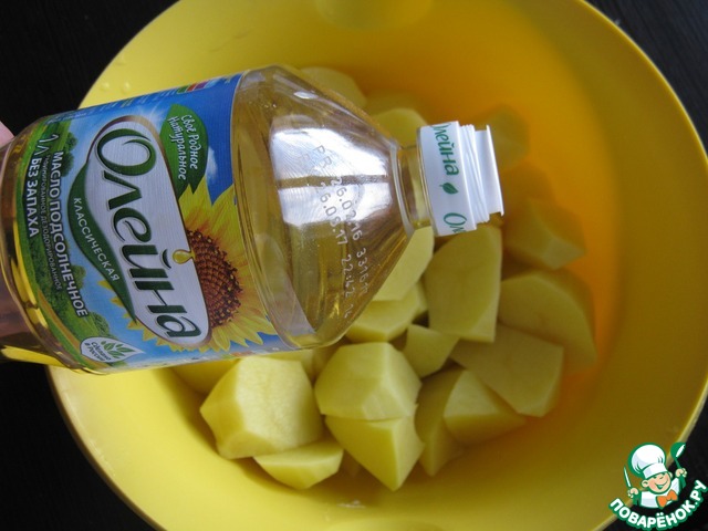 Картофель очистить, нарезать, влить растительное масло (5 ст. л.).