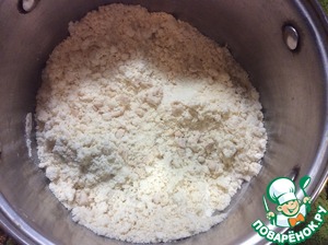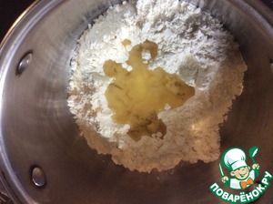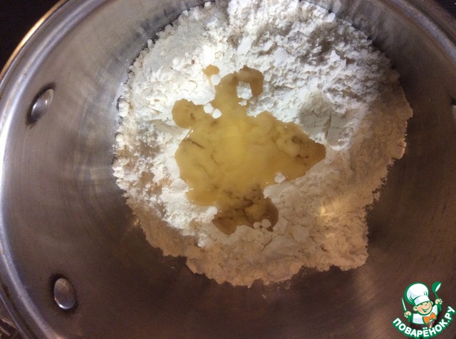 Муку высыпаем в кастрюлю, добавляем соль и растительное масло.