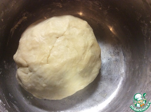 Добавляем мелко поломанные дрожжи. Постепенно вливая теплую воду, замешиваем тесто. Хорошо вымешиваем, собираем в шар, накрываем пакетом и отправляем в теплое место для увеличения объема в несколько раз.