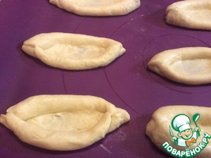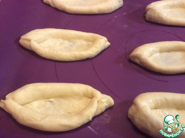 Со вторым бортиком проделываем то же самое. Концы бортиков защипываем, формируя нос лодки. Переносим лодочку на противень, застеленный бумагой для выпечки, или силиконовый коврик. Отправляем в разогретую до 200°С духовку на 10 минут.