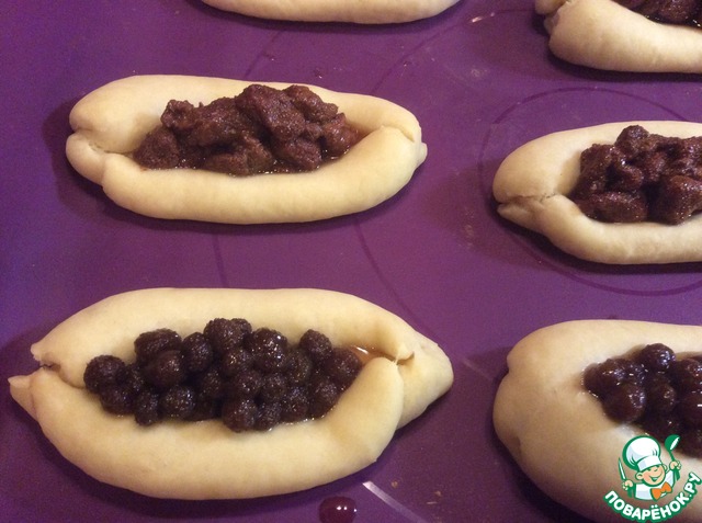 Тем временем ягоды откинем на сито, чтобы дать стечь лишней жидкости. Я использовала маленькое ситечко для фильтрования заварки. Укладывала его поверх маленькой тарелки, выкладывала порциями ягоды, и сироп стекал. По истечении 10 минут достаем лодочки и выкладываем начинку. Отправляем обратно в духовку до образования золотистого цвета на бортиках лодки. У меня это заняло еще 20 минут.