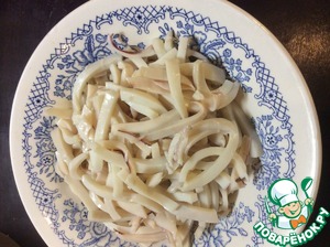 Кальмары очистить, отварить в течение 2 минут в подсоленной воде и нарезать соломкой.
