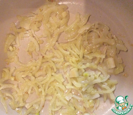 Выложить лук и обжаривать на минимальном огне до прозрачности и достижения легкого золотистого оттенка.