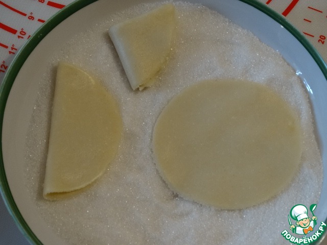 В широкую и глубокую тарелку насыпаем сахар. Обмакиваем одну сторону кружка, складываем пополам, сахаром вовнутрь. Еще раз обмакиваем и складываем, и еще раз одной стороной в сахар.