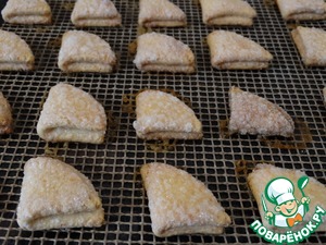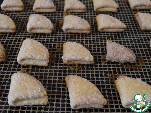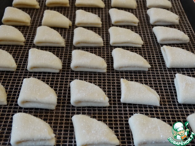 Получаются вот такие "уголки". Выкладываем на застеленный пергаментом противень чистой стороной вниз. Оставляем небольшой промежуток между печенюшками. Сейчас у меня вместо пергамента вот такой сетчатый коврик и специальный лист из стекловолокна, очень удобно, ничего не пригорает и не прилипает.
