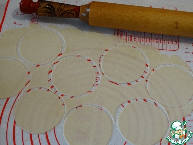 Отдохнувшее тесто раскатываем в тонкий пласт до прозрачности. На фото виден рисунок коврика через слой теста. Далее, вырезаем круги подходящей посудиной, у меня кружка.