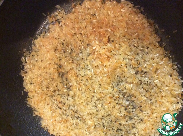 • На сковороде с толстым дном или в казане раскалить растительное масло, всыпать рис и, периодически помешивая, обжарить его до золотистого цвета.