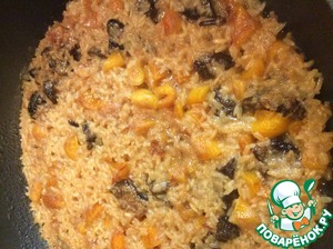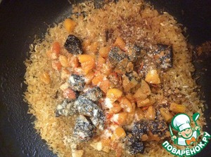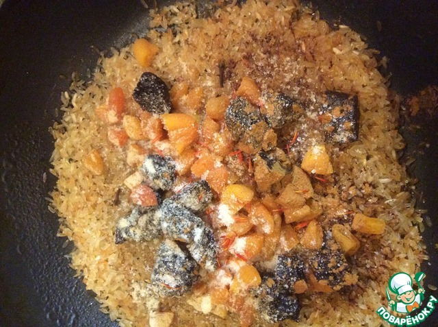 • Добавить в обжаренный рис курагу, чернослив, корицу, кардамон, гвоздику, шафран, соль и сахар. Тщательно перемешать и обжаривать на небольшом огне еще 5 минут.