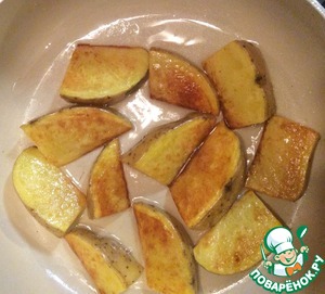 Картофель тщательно моем и режем вдоль на 6 долек. На сковороде разогреваем растительное масло и обжариваем картофельные дольки с 3-х сторон до золотистой корочки.