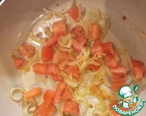 Пока картофель жарится, очистим лук и нарежем его тонкими полукольцами. Помидор нарежем кубиком размером около 1,5-2 см. На сковороде разогреем 1 ст. ложку растительного масла обжарим лук до легкого золотистого цвета. Добавим нарезанные помидоры. Жарим еще 3 минуты.