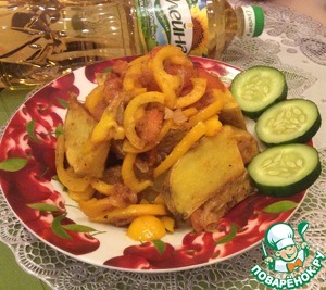 Обжариваем смесь пару минут и добавляем обжаренные картофельные дольки. Перемешиваем в последний раз и прогреваем все вместе на сковороде 1 минуту.