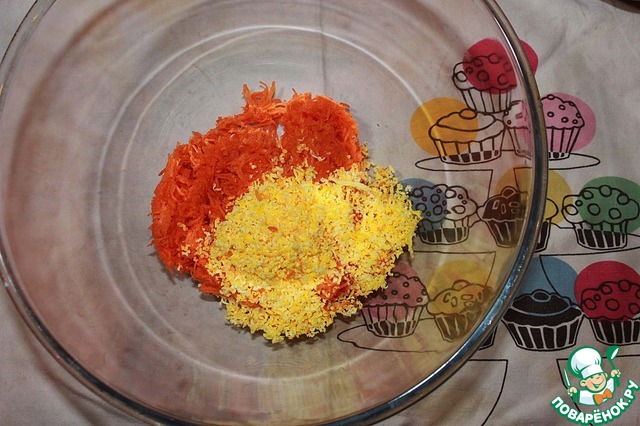 Натираем морковь и цедру апельсина, высыпаем их в одну миску и перемешиваем. -