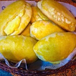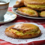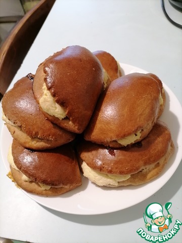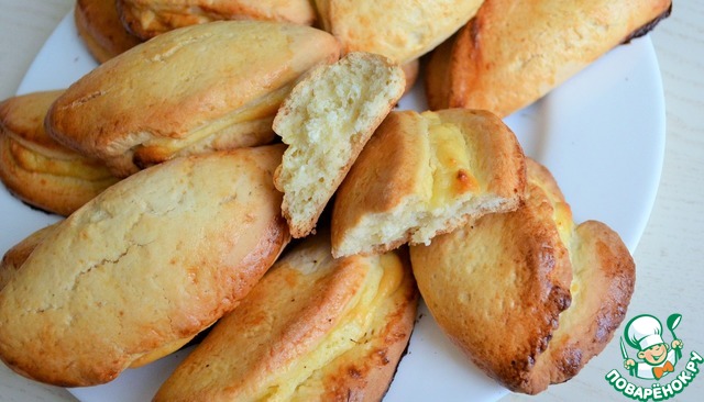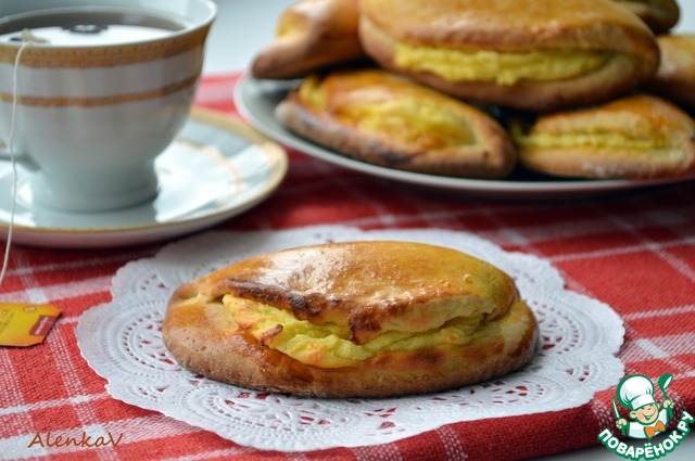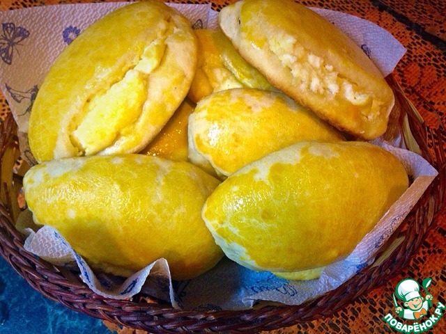 Рукой из кружка формируем овальную лепешечку, слишком тонко не делайте, на нижний край начинку, накрыть верхним краем и на противень. Смазать яичком.