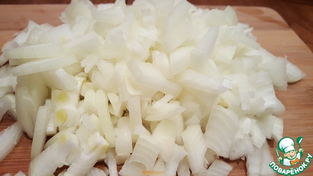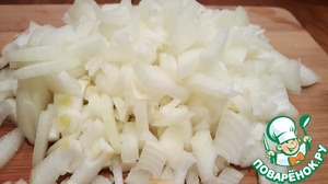 • Мелко нарезать очищенный репчатый лук. Разогреть сковороду, добавить оливковое масло. Когда масло нагреется выложить лук на сковороду и немного обжарить.