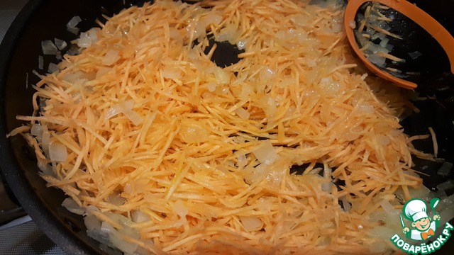 • Очистить морковь. Натереть морковь на тёрке для морковки по-корейски. Или мелко нарезать. Добавить морковь к луку и обжарить. Добавить 20 мл терияки и ещё немного потушить.