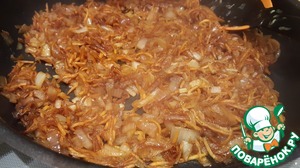 • Половину обжаренных лука с морковью добавить к фаршу. Ко второй половине добавить отжатую квашеную капусту. Слегка обжарить капусту, накрыть крышкой и тушить минут 5.