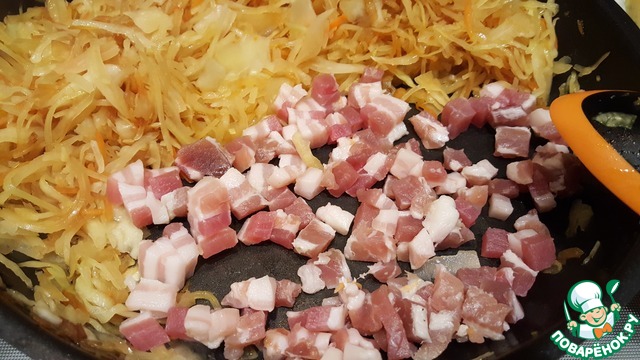 • Нарезать мелко солёную грудинку, у меня с большим содержанием мяса. Отодвинуть капусту и выложить на сковороду грудинку. Немного обжарить. Смешать начинку.