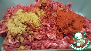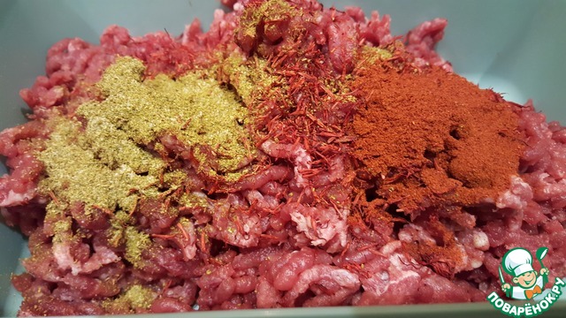 • Провернуть говядину в мясорубке с мелкой сеткой. Сложить фарш в подходящую ёмкость. Добавить специи и 30 мл соуса-маринада. Тщательно вымешать фарш, накрыть ёмкость крышкой и убрать в холодильник на сутки или оставить при комнатной температуре часа на 4.