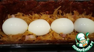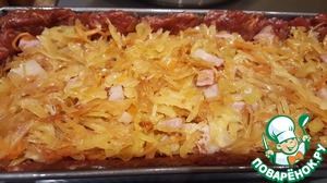 • Выложить половину тушёной капусты с грудинкой.