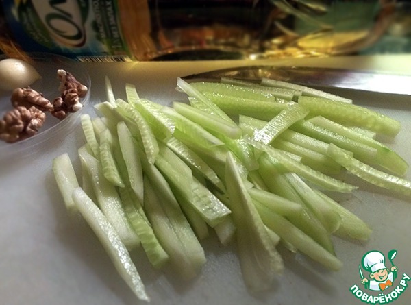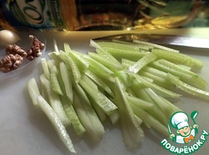 Огурец помыть, очистить от кожицы и нарезать соломкой.