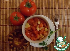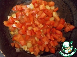 Добавить измельченный чеснок, кориандр и мелко нарезанные помидоры. Хорошо перемешать и тушить 1–2 минуты.