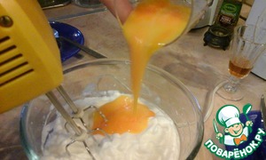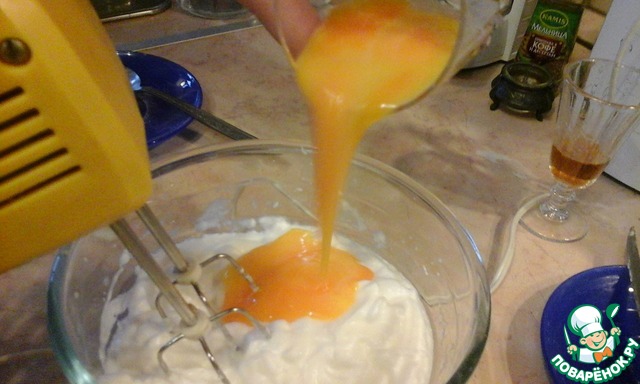 Потом вливаем желтки. Я думаю нам пора достать смесь номер 2 из микроволновки.