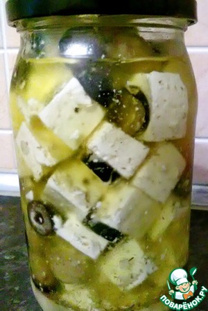 Сыр достанем из банки где он мариновался по рецепту Любы http://www.povarenok .ru/recipes/show/104 828/. Но я немного его изменил. Изменения есть в моем дневнике в отчете.