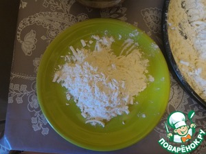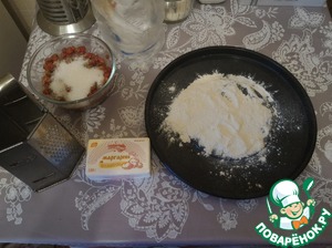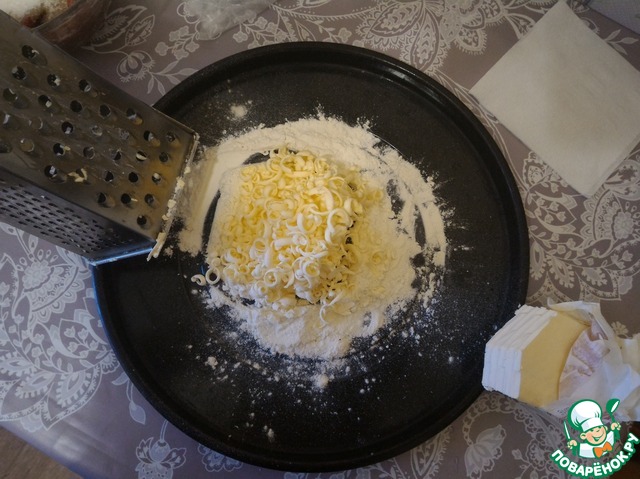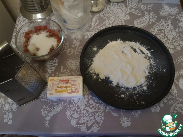 Насыпаем в форму горсть муки и натираем на большой терке маргарин (он должень быть заморожен).