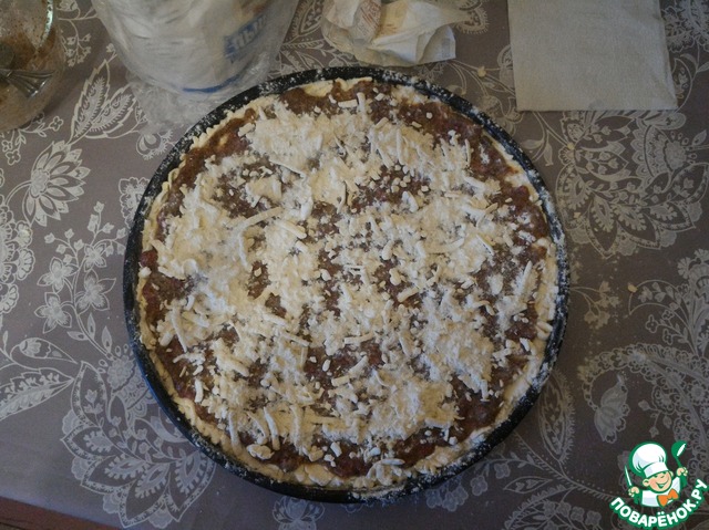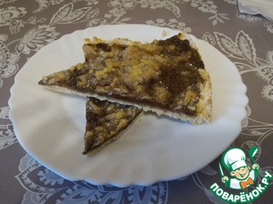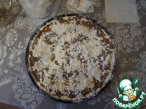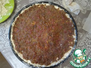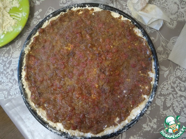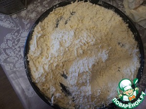 Теперь разравниваем крошку по форме, но не утрамбовываем. После выкладываем сверху нашу начинку.