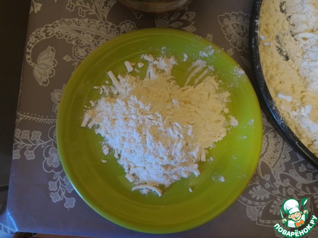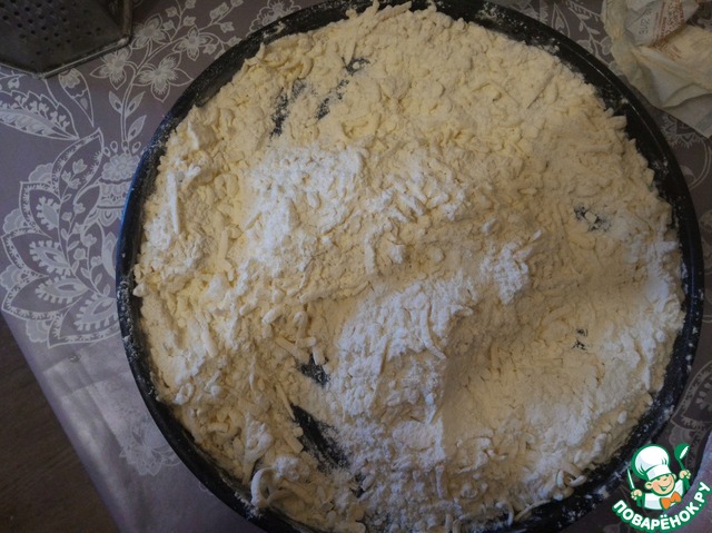 После того, как натерли 1/3 маргарина, посыпаем немного мукой и продолжаем натирать следующую часть. Должна получиться мучная крошка.