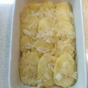 Выложить внахлест кружочки картофеля, а сверху обжаренный лук, приправить перцем и чуть-чуть посолить.
