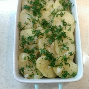 Далее снова слой из картофеля, лука и рыбы. Последний слой из картофеля поперчите, присыпьте мелко нарезанным укропом и чуть-чуть посолите, по желанию добавьте любимые специи.