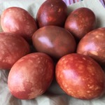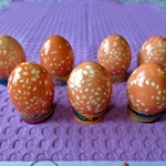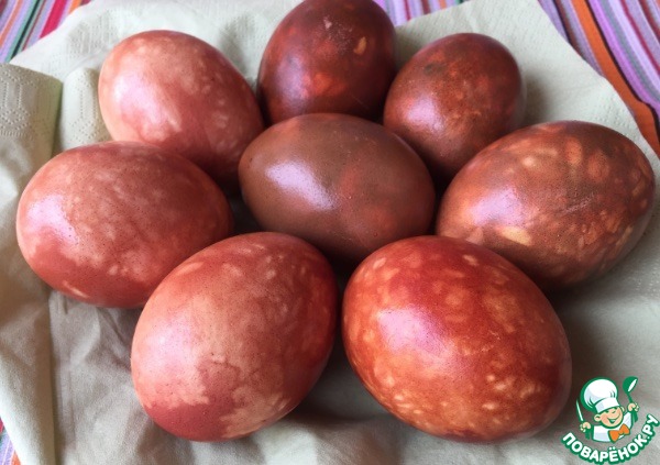 Чтобы окрасить просто яйца (они должны быть так же, как отвар, комнатной температуры), опустить их в отвар и варить 12 минут. Шумовкой вынуть яйца, остудить в холодной воде. Когда яйца остынут, протереть их салфеткой, смоченной в растительном масле. Ну, а теперь про рисовый окрас... -