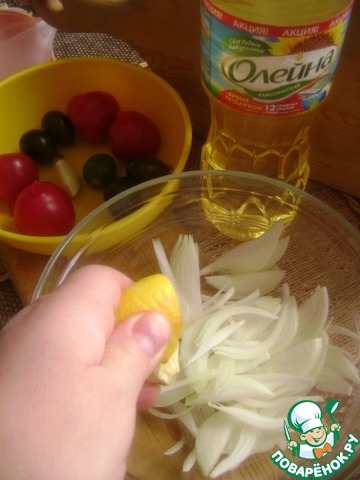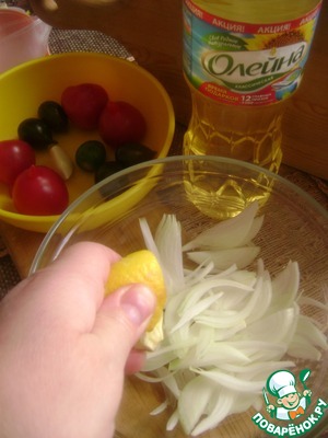 Лук нашинковать тонко –лучше вдоль луковицы. Присыпать сахаром и солью, полить лимонным соком и немножко промять. Оставить мариноваться минут на 10.